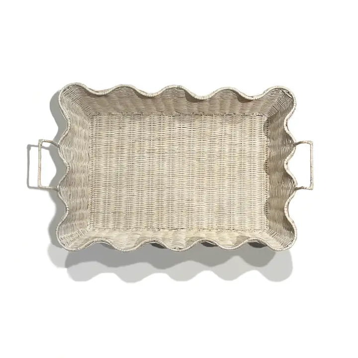 LARGE SCALLOPED TRAY WITH HANDLES IN WHITE. 24" X 17" X 5" . WIRE INTERNAL FRAMING WRAPPED WITH RATTAN PROVIDES STRENGTH AND STURDY CONSTRUCTION. UTILITY + BEAUTY MAKE THIS TRAY VERSATILITY AT ITS' BEST!